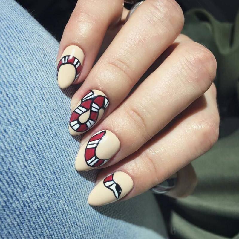 Настоящим хитом 2020 года стал маникюр в стиле известного бренда Гуччи. Одним из его символов является красная змея с бело-зелеными полосами. Для создания гармоничного дизайна нейл-мастера наносят на все ноготки такое цветовое сочетание и лишь на одном или двух рисуют змею. В некоторых случаях дополнением может быть золотистые, бежевый, черный или коричневый цвет. Что касается декоративного оформления, то различные блестки и стразы используются довольно часто. В целом такой маникюр достаточно яркий, активный. Поэтому его выбирают на каждый день и для событий, но только не для работы в офисе.