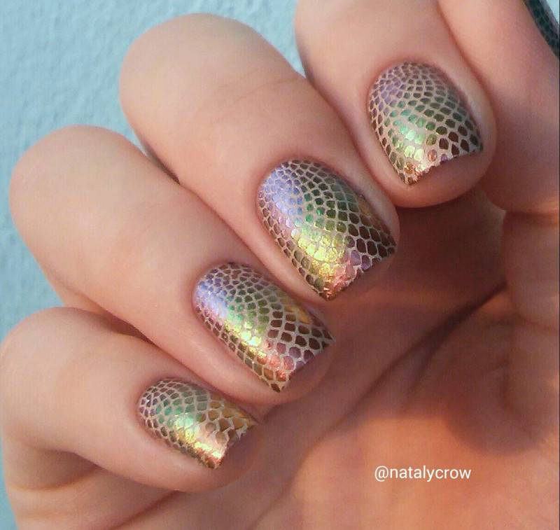 Переводная фольга поможет создать блестящие ячейки.Действовать надо быстро и аккуратно: крепко прижать фольгу к ногтевой поверхности и резко снять. Клейкий слой станет красиво поблескивать. Обрамление чешуйчатых ромбиков приобретет мерцающий вид.