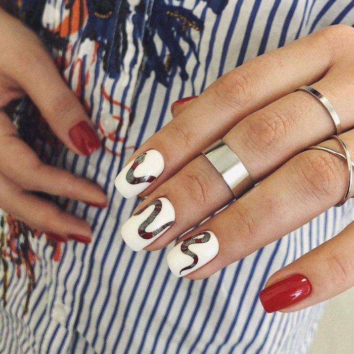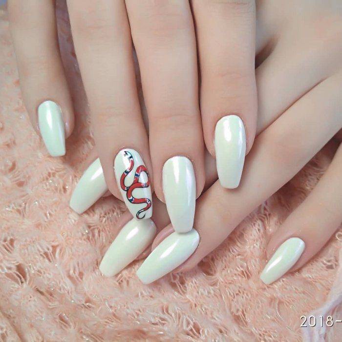 Змея на белом фоне выглядит очень выразительно. Для такого покрытия можно дать полную свободу выбора цвета рисунка. Это могут быть совершенно разные цвета и оттенки, как самые нежные, так и самые яркие и насыщенные. Можно покрыть несколько ногтей в тон рисунку, использовать втирку или дополнить маникюр блестящим дизайном.