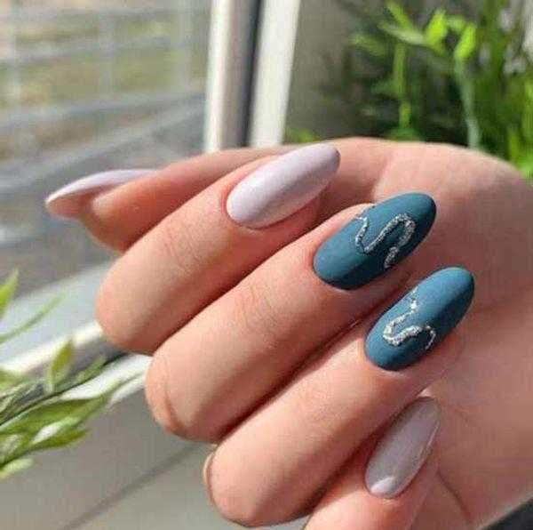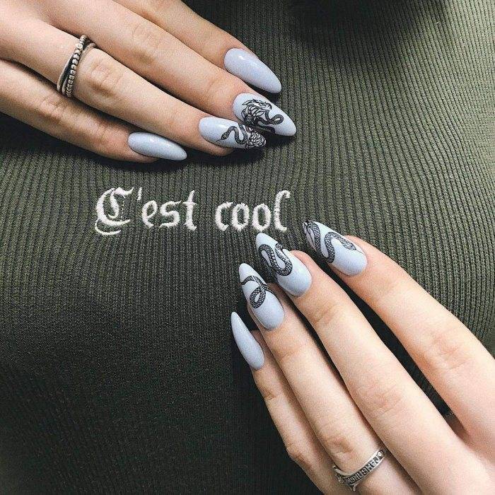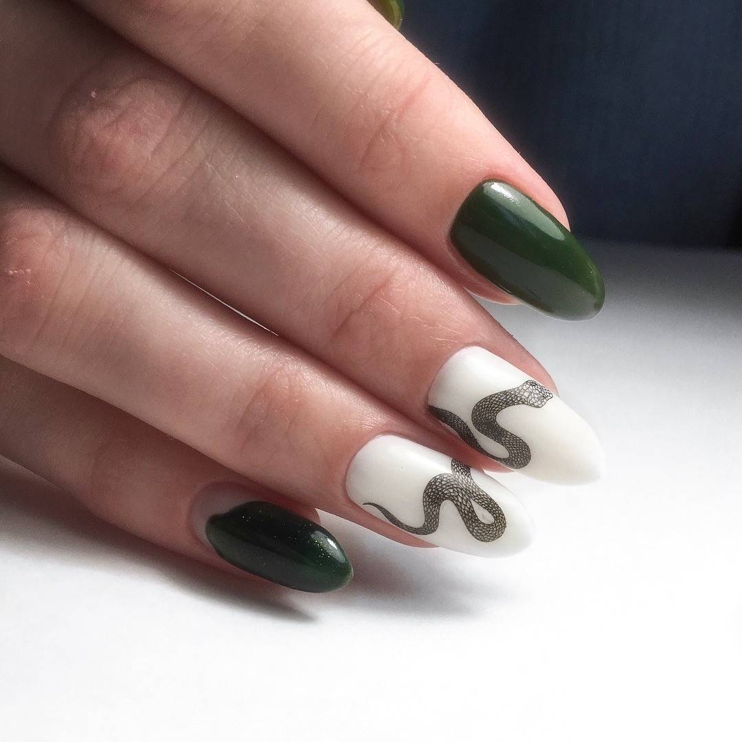 Что касается формы ногтей, змеиный дизайн универсален. Принт можно создать как на овальных, так и на квадратных ноготках. Рисунок змейки красиво сочетается с формой миндаль и заостренными ноготками.