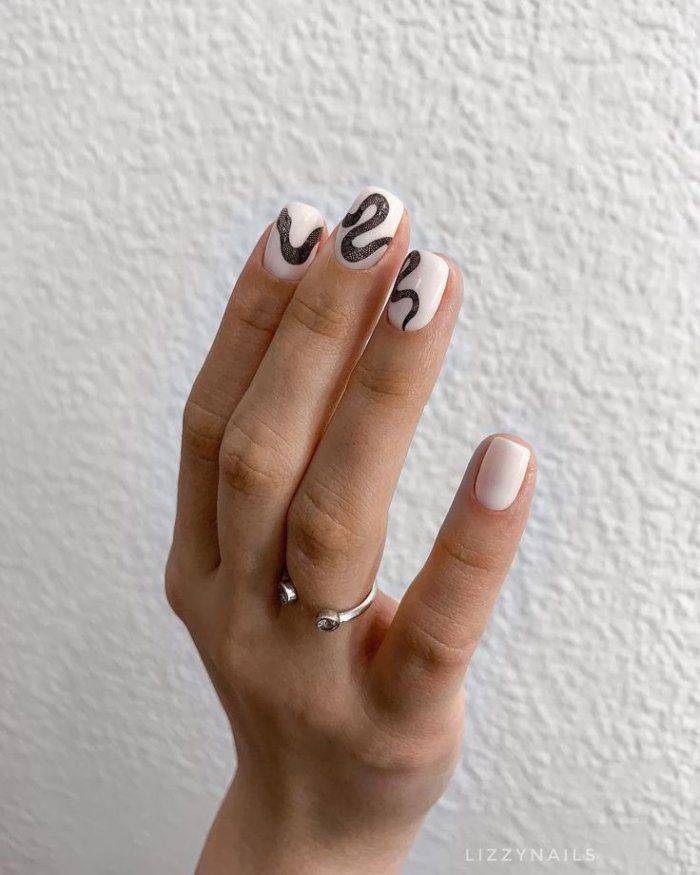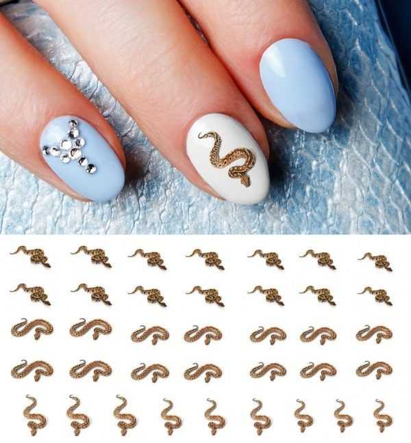 Рисунок змеи может визуально вытянуть короткие ногтевые пластины, сделав их длиннее. Чтобы зрительный обман сработал, изображать змейку нужно не поперек, а вдоль ногтевой пластины, вертикально.