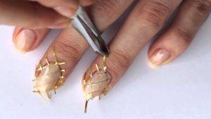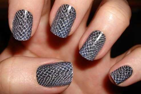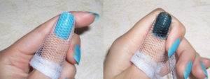 Иногда сеточку создают с помощью тюля, кружев или старых сетчатых колготок.Покрытый темным лаком и высохший ноготь обматывают приготовленной сетчатой тканью. Сетка не должна смещаться, поэтому ее фиксирует чем-нибудь либо зажимают пальцами.