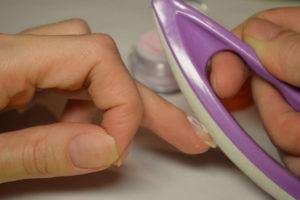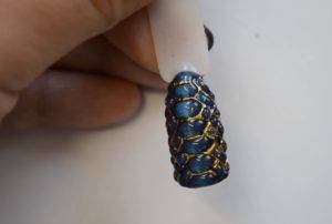 - Нанести с помощью кисти или иглы линию узора. Рисовать следует максимально аккуратно, без спешки. Рисунок полностью высыхает только под ультрафиолетовой лампой. Оптимальнее всего делать разные по ширине и длине линии, в местах изломов – утолщять их, а на прямых участках – утончать.
