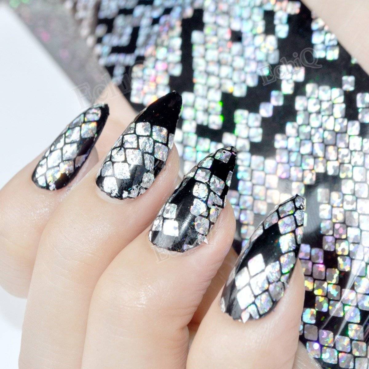Переводная фольга поможет создать блестящие ячейки.Действовать надо быстро и аккуратно: крепко прижать фольгу к ногтевой поверхности и резко снять. Клейкий слой станет красиво поблескивать. Обрамление чешуйчатых ромбиков приобретет мерцающий вид.