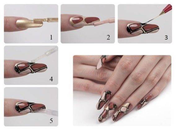 Сначала ноготь покрывают подходящим лаком, сушат, рисуют сеточку черным цветом. Иногда ячейки оттеняют фольгой, покрывают биоскульптурным прозрачным лаком. Нередко рисунок выполняют в однотонной гамме.