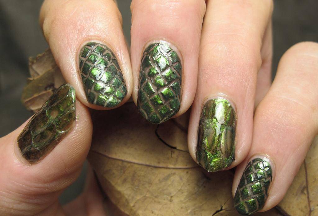 Очень эффектно смотрится на длинных ногтях объемный рисунок, имитирующий кожу рептилии. Красивые весы наносятся гель-лаком или раскрашиваются акриловой краской разных оттенков