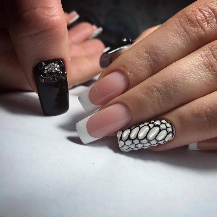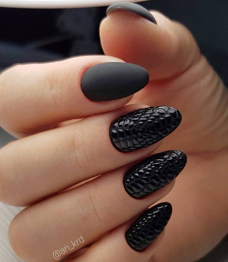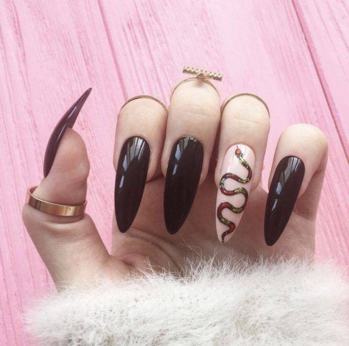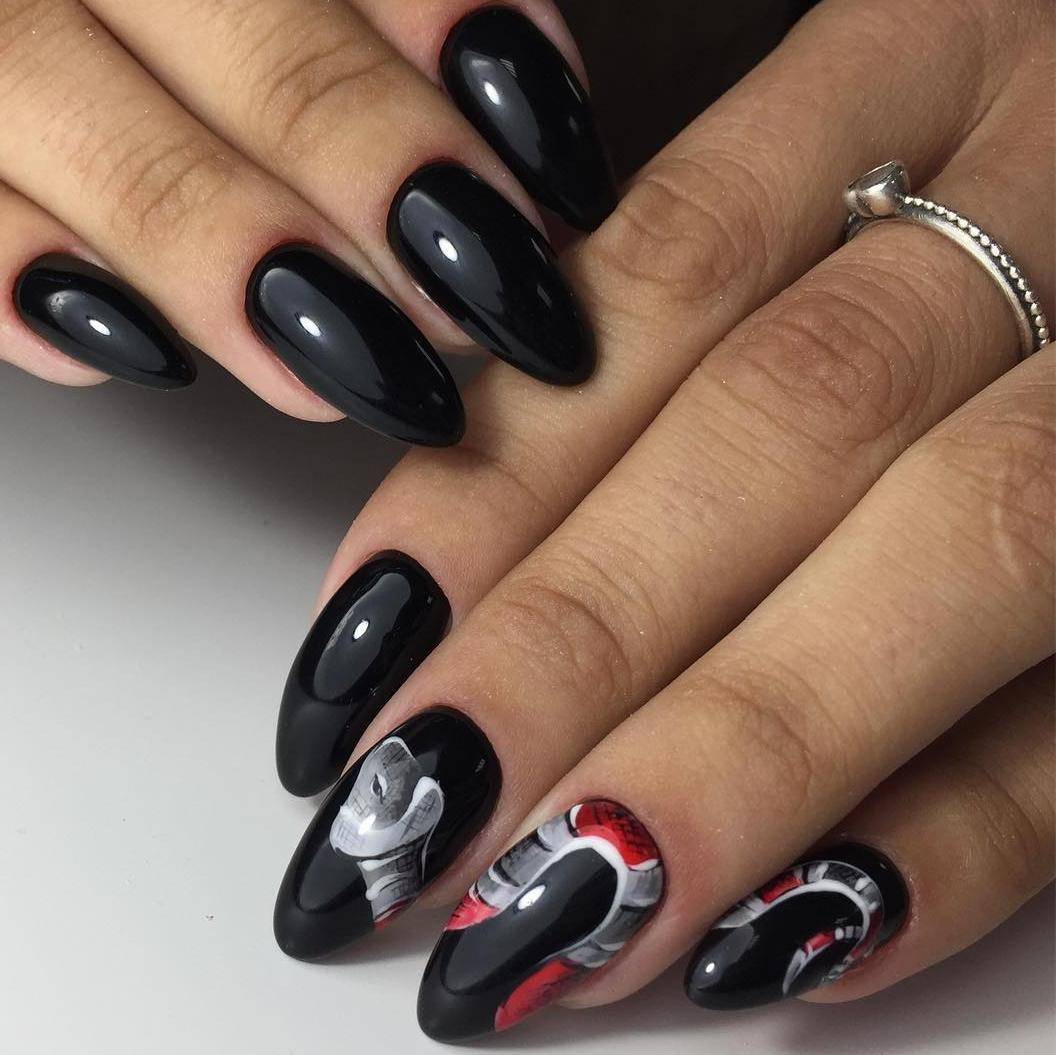 С таким глубоким оттенком можно просто создать необычный маникюр и почувствовать себя смертельной красавицей. Ногти одной руки покройте черным, а на другой покажите этим тоном рептилию. В качестве основного покрытия в этом случае очень хорошо подойдет желтый, оранжевый, красный или другие яркие и контрастные оттенки. Также для изображения змеи на черной основе можно использовать любую палитру, украшать рисунки декором и использовать блестящие лаки.