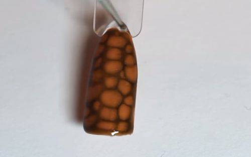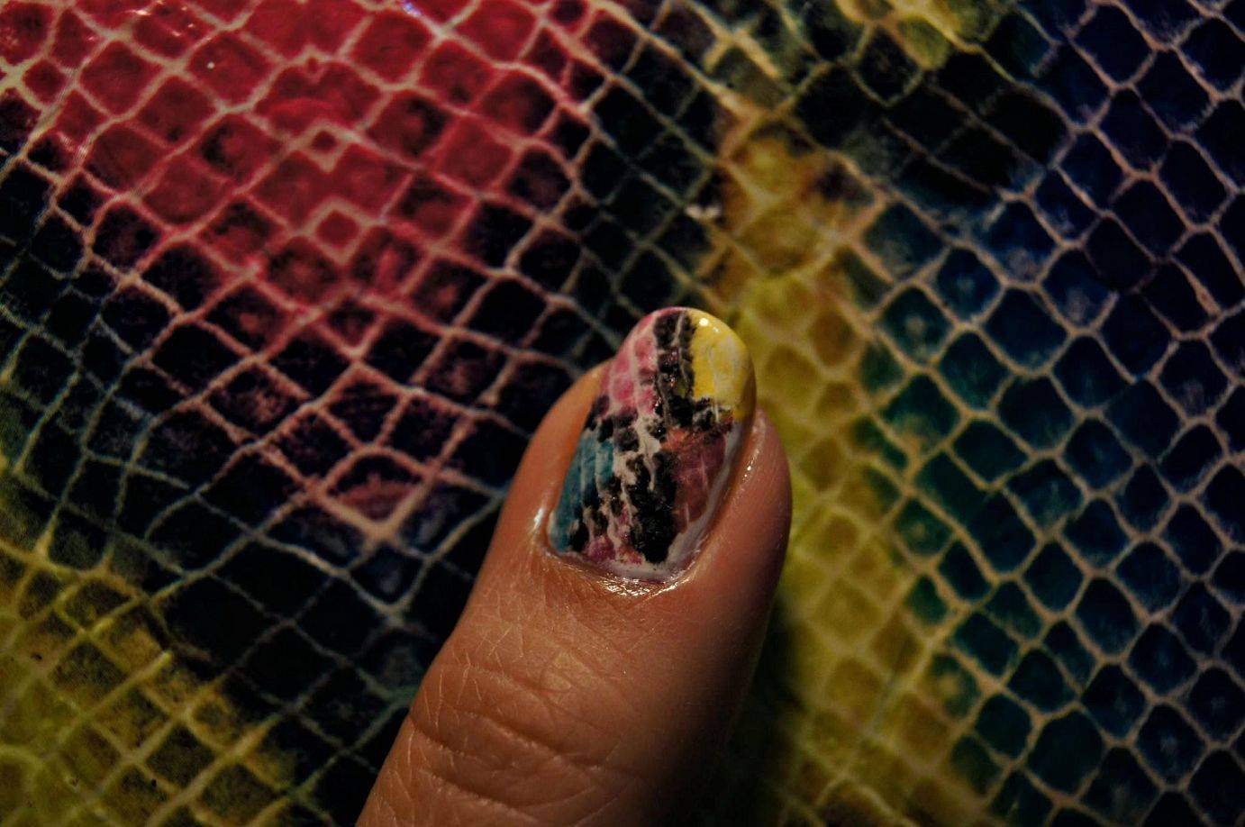 Так без особых усилий, нанесите лак в качестве основы. А сверху покройте ноготь специальным средством. Лак немного разойдется и создастся эффект змеиной кожи. Очень легко и не нужно каждый ноготь оборачивать сеткой.