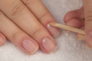 | Шаг 1 | ![]() | Отодвигаем отросшую кутикулу апельсиновой палочкой к основанию ногтей. Предварительно можно нанести размягчающий состав или сделать теплую ванночку. |