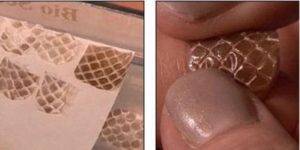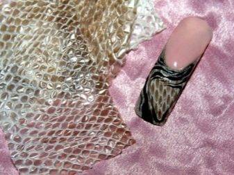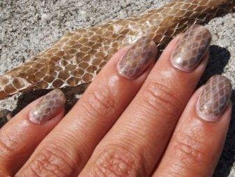 Редкий и очень дорогой способ нанесения сброшенной в период линьки змеиной кожи, вырезанной по форме ногтя, применяют для особенных случаев. После закрепления фрагмента на ногтевой пластине следует покрытие прозрачным лаком.