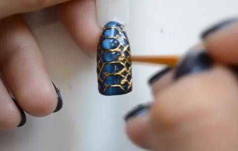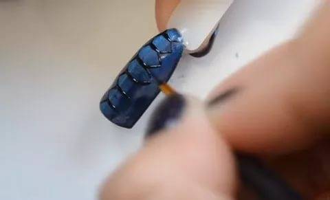 Нарисовать чешуйки можно путем нанесения черным лаком параллельных горизонтальных полосок. Затем их с боков соединяют линиями таким образом, чтобы образовались шестиугольники. От них к краю ногтя ведут полосы по диагонали сначала вверх, потом вниз, образуя сеточку вокруг больших чешуек.