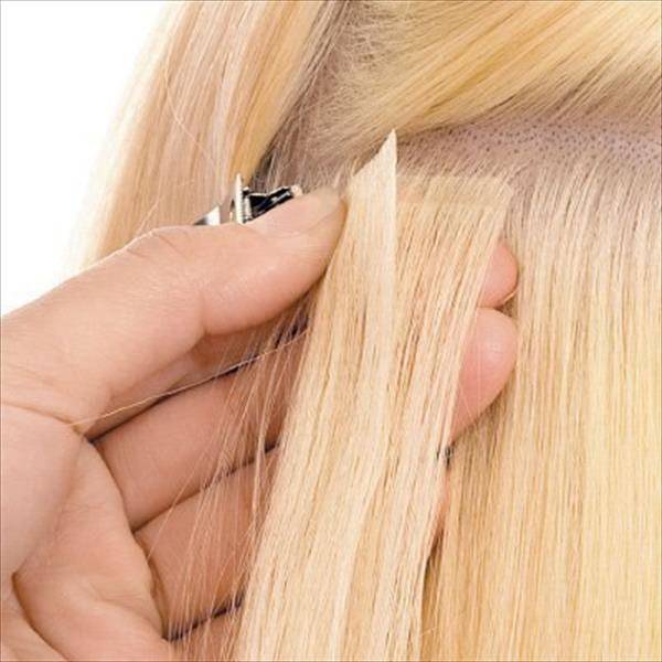 – присоединении волос на клеевых лентах к родным. Для полного наращивания потребуется всего 40-60 прядей. Ленты практически не заметны. К минусам относться срок носки от 1-2 месяцев и не прочная фиксация лент.