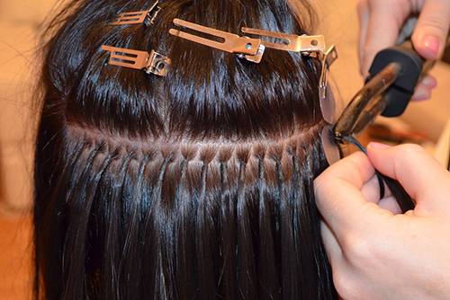 Данный метод также называют английским или итальянским. Заключается он в использовании специальных кератиновых капсул. Соединяются искусственные пряди с натуральными при помощи специальных горячих щипцов, под действием которых капсула плавится. Получается небольшая спайка круглой формы. Визуально ее практически бывает незаметно.