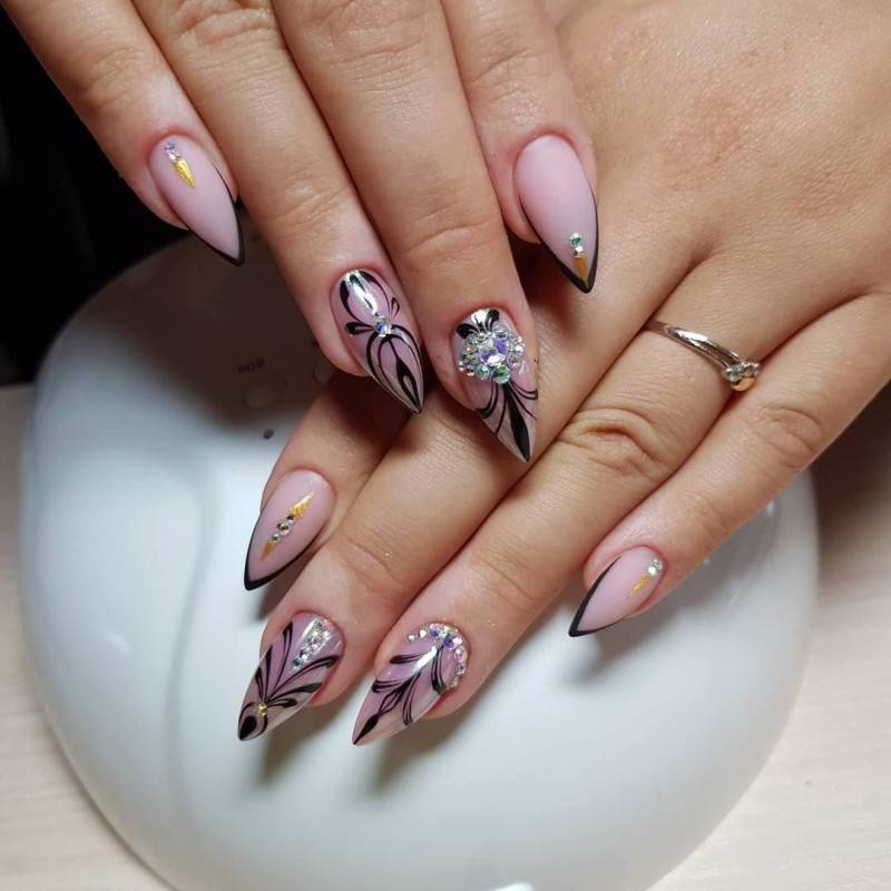 Острые ноготки сразу бросаются в глаза и привлекают взгляды вне зависимости от оформления. Специалисты советуют не делать маникюр слишком вычурным. Хорошо подойдёт классический французский маникюр или цветной выкладной френч в нежном варианте.