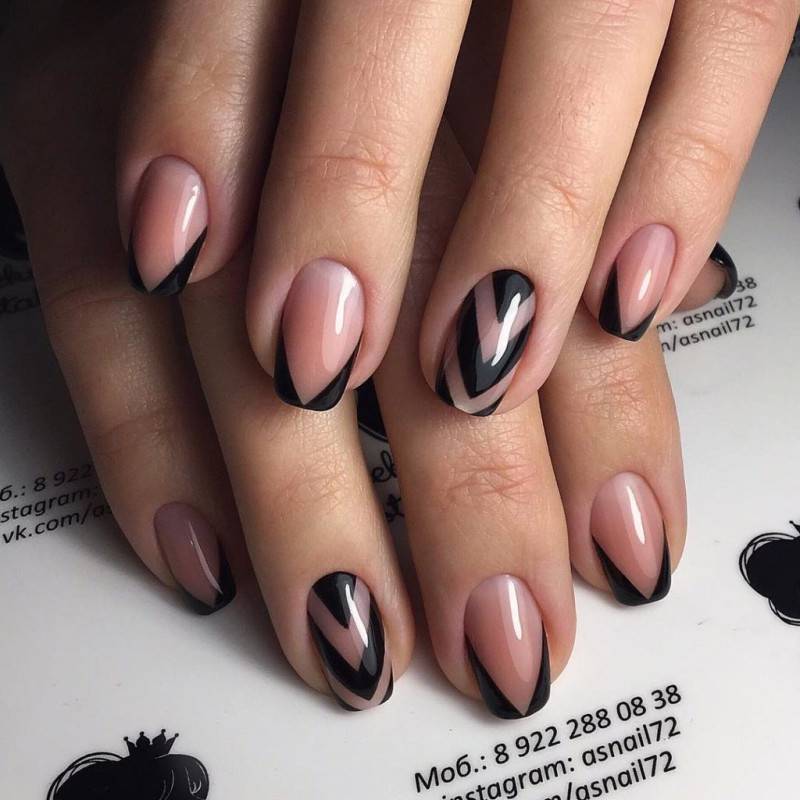 На длинных ногтях его можно разнообразить геометрическим артом, который потерял актуальность в ярких цветах, но не выбивается из топа в чёрном цвете. Применяются различные техники нанесения: от крупных треугольников до мелкой паутинки. Очень актуально будет смотреться матовое исполнение подложки ногтя с таким дизайном.