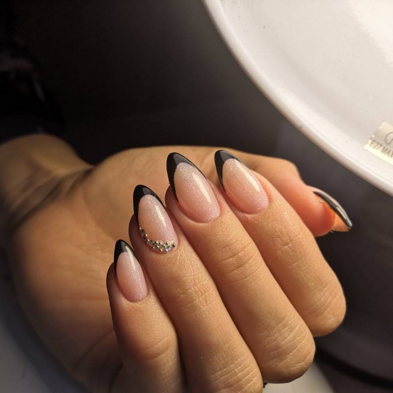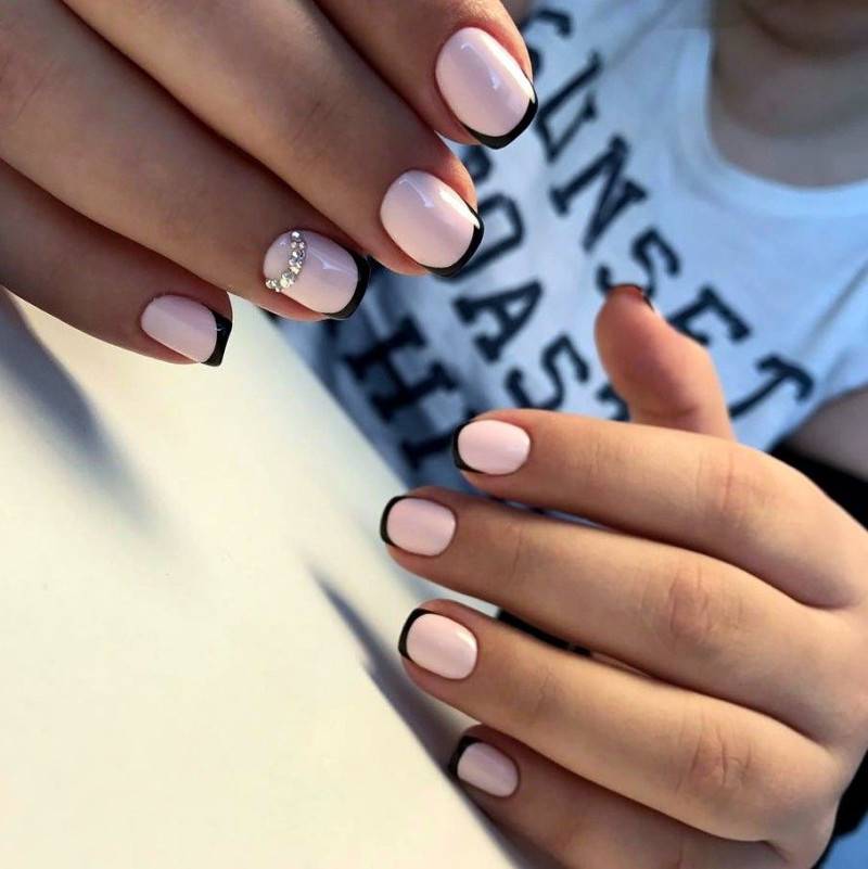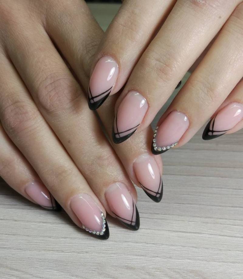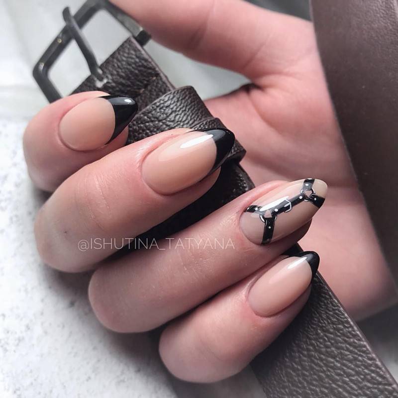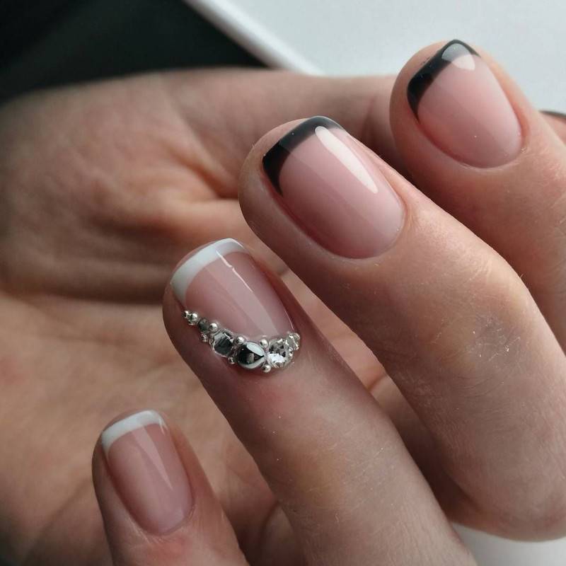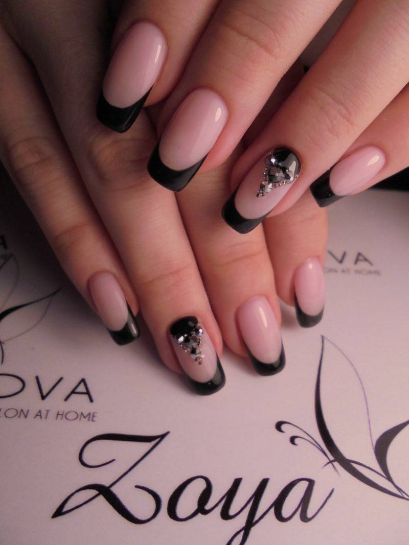 Если вы немного устали от моно маникюра в темном оттенке, выбирайте черный френч, дополняя его дизайном — от минималистичных полосок до обилия блесток и стразов.