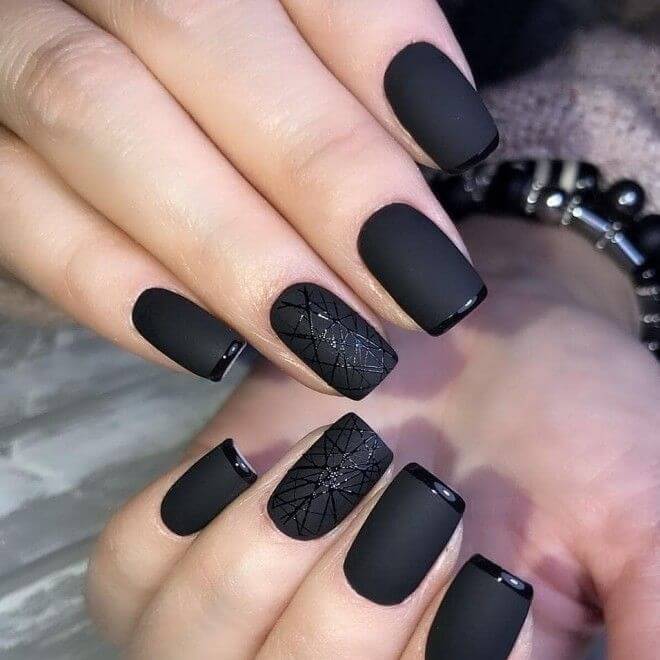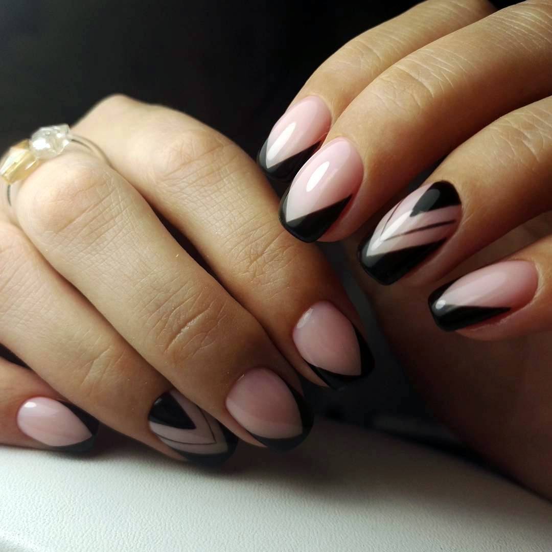 На длинных ногтях его можно разнообразить геометрическим артом, который потерял актуальность в ярких цветах, но не выбивается из топа в чёрном цвете. Применяются различные техники нанесения: от крупных треугольников до мелкой паутинки. Очень актуально будет смотреться матовое исполнение подложки ногтя с таким дизайном.
