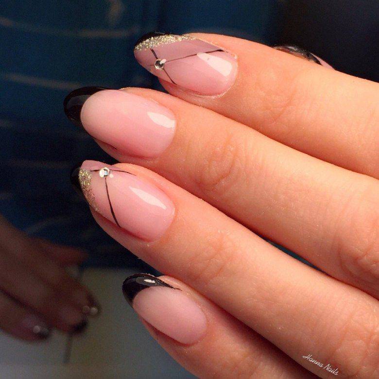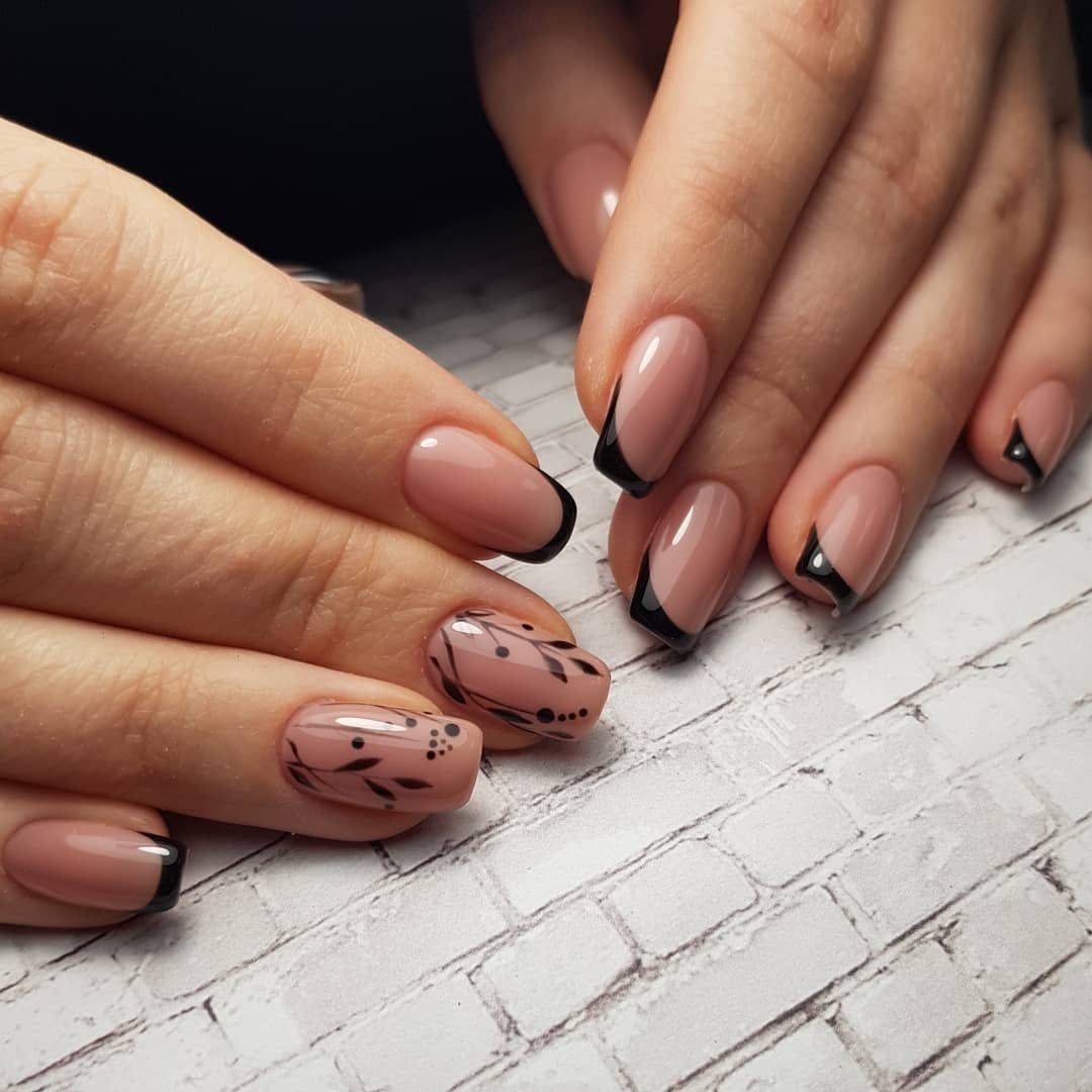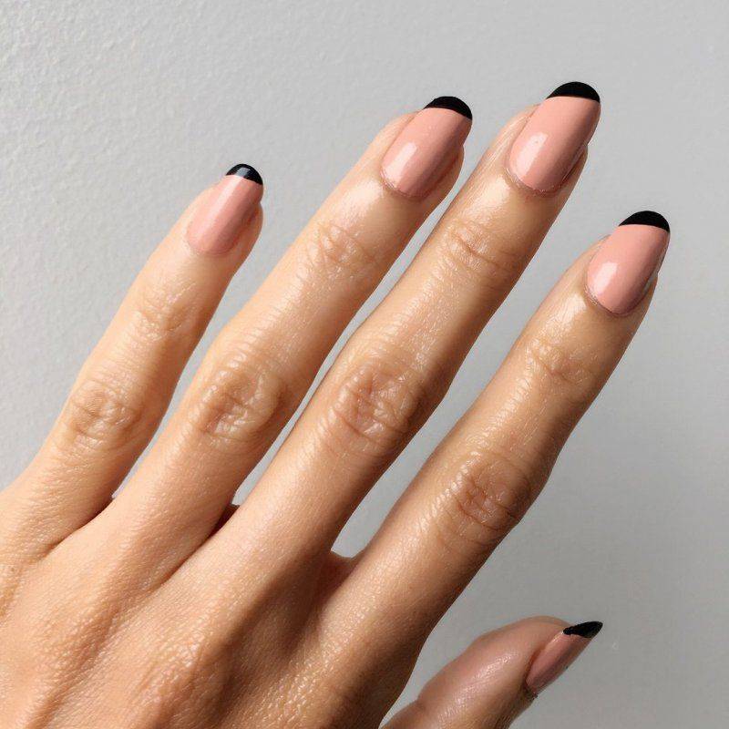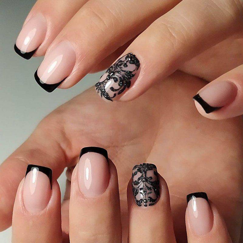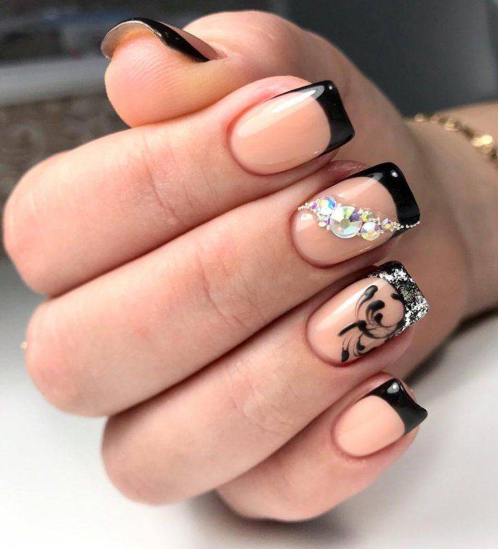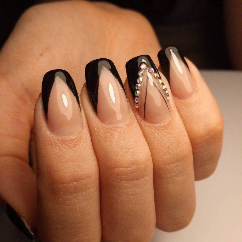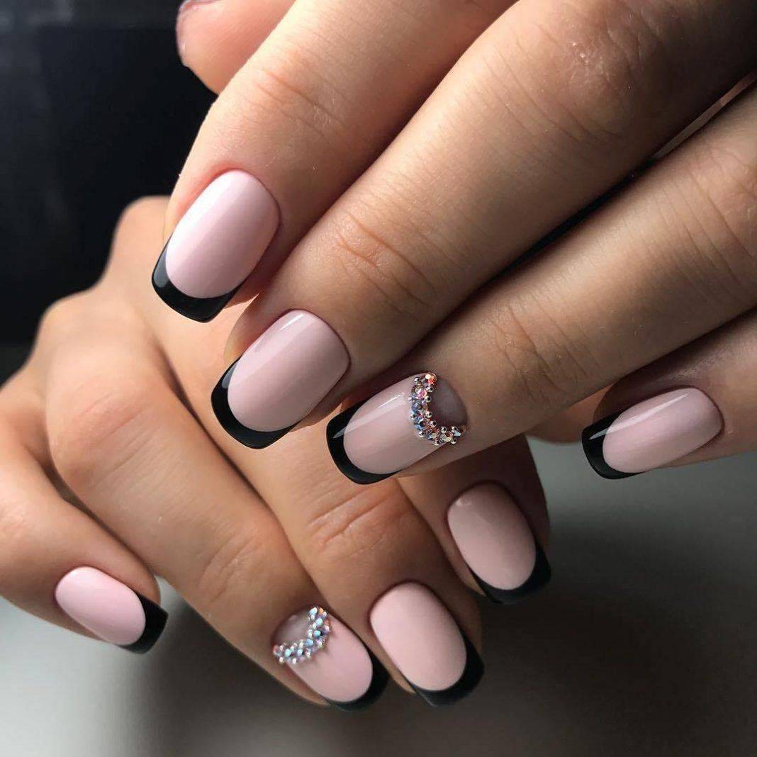 Если вы немного устали от моно маникюра в темном оттенке, выбирайте черный френч, дополняя его дизайном — от минималистичных полосок до обилия блесток и стразов.
