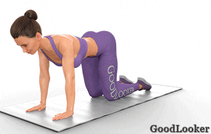 - Махи назад выполняются в положении «стоя на локтях и коленях», то есть упор идет на все конечности. Чем выше поднимается нога – тем больше нагрузка для бедер и ягодиц.