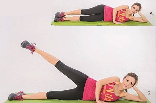 | Махи ногами из положения лежа на боку | Складки внизу живота часто соседствуют со “свиными ушками” на боках талии. Данное упражнение позволит избавиться от этого дефекта фигуры очень быстро. Алгоритм выполнения такой: