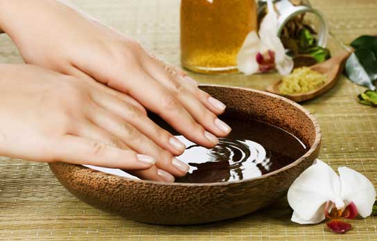Очень хороший эффект от солевых ванночек. Достаточно несколько столовых ложек морской соли залить горячей водой, дать ей остыть до комфортной температуры, добавить 5-6 капель масла (репейного, оливкового, розы, шалфея) и погрузить пальцы в емкость с этим раствором. Хороший эффект также оказывают масла сладкого миндаля, персика, абрикоса, зародышей пшеницы.