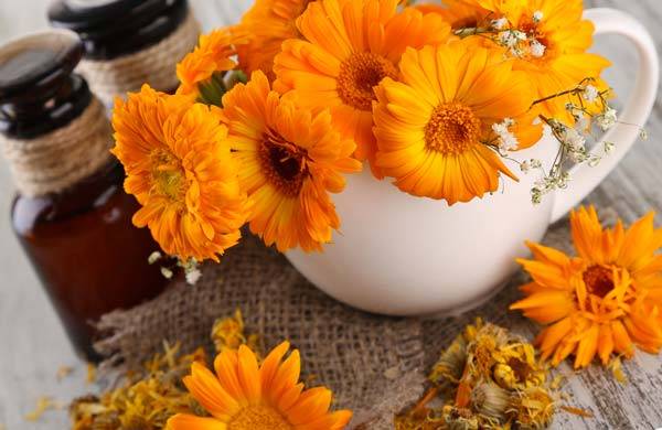 - Календула – отличное противовоспалительное средство, которое используется при раздражениях, высыпаниях, способствует смягчению и питанию кожи.