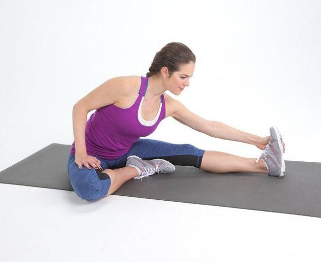 - Сядьте на пол. Носки тянем на себя, пальцами рук достаем до пальцев ног. Почувствовав максимальное напряжение — задержитесь на 5-7 секунд.