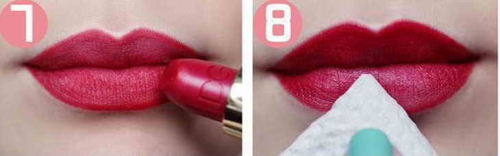 - Еще один секрет заключается в том, чтобы использовать помаду тёмного оттенка, к примеру бордово-красную. Такие цвета, как правило, держатся намного дольше, чем нюдовые.