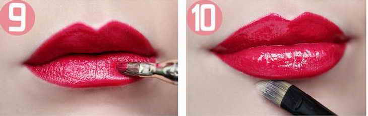 Проделывайте это от внешней части губ к внутренней для сохранения четкости линий.Весьма удобно применение специальных кистей. Для повышения стойкости макияжа можете полностью зарисовать губы карандашом.