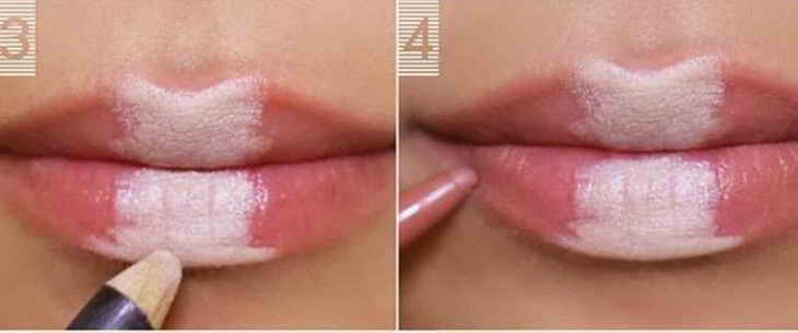 Чтобы они стали пышными, необходимо подобрать тон карандаша. Одно из главных правил визажистов — темные цвета делают рот меньше, а нюдовые светлые придают рту пухлость. Поэтому необходимо обводить контуры светлыми карандашами. Подходит персиковый, нежно-розовый, бежево-розовый тон.