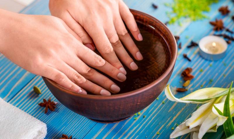 - Опустите пальцы в подготовленную емкость на 7–10 минут. Так как время длительное, выполняйте процедуру на одной руке, вторая в это время будет свободна. Можно, пользуясь случаем, поболтать по телефону, выпить кофе, порыться в сетях.