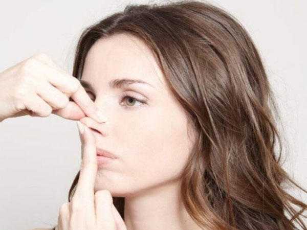 - Сделайте захват переносицы указательным и большим пальцами, опустив их ближе к ноздрям.
