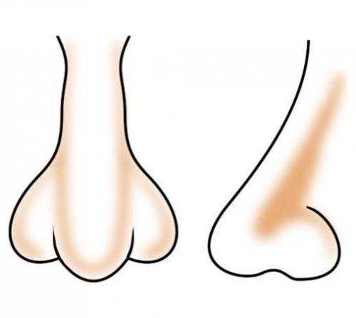 - Если нос выглядит слишком коротким, то необходимо применить противоположную тактику, обозначить затемнением линию от бровей до боковых участков носа, что позволит визуально вытянуть длину. На спинку носа, уже по традиции, наносим высветляющее средство, и точку светлого оттенка ставим на самый его кончик, после чего хорошенько растушевываем.