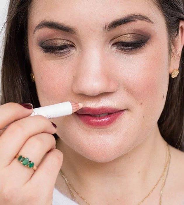 - Нанести контурный карандаш натурального цвета (или на тон темнее), на несколько миллиметров выступая на границу губ.