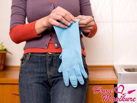 - Контактирование с бытовой химией ограничивают – оно сушит ногти. Домашнюю работу выполняют в перчатках.