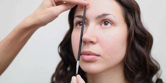 - Наметьте, где будет находиться внутренняя точка бровной дуги, для этого приложите к внутренней части века длинный карандаш, чтобы он соприкасался с крылом носа. Внешняя точка определяется прикладыванием карандаша от крыла носа до внешнего уголка глаза. Получить правильный изгиб возможно, проведя линию из той же исходной точки через центр зрачка.