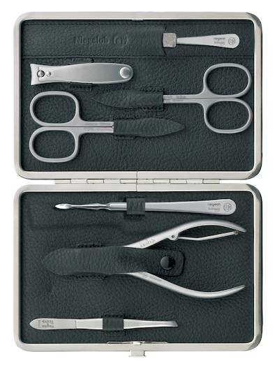 Классический маникюрный набор включает в себя ножницы, щипчики (кусачки), пилку, пушер и пинцет. В зависимости от производителя в комплект входят ножницы с загнутыми лезвиями для обрезания кутикул и книпсер. Пушер в таких наборах соединён с шабером.