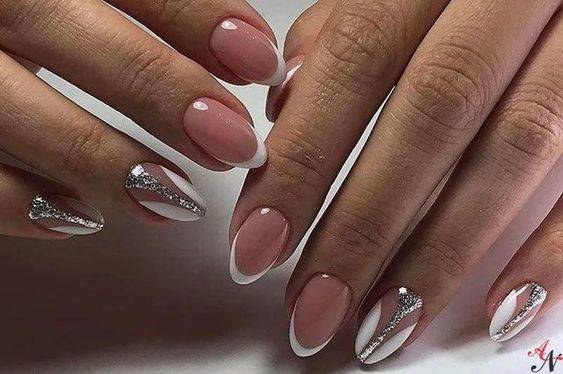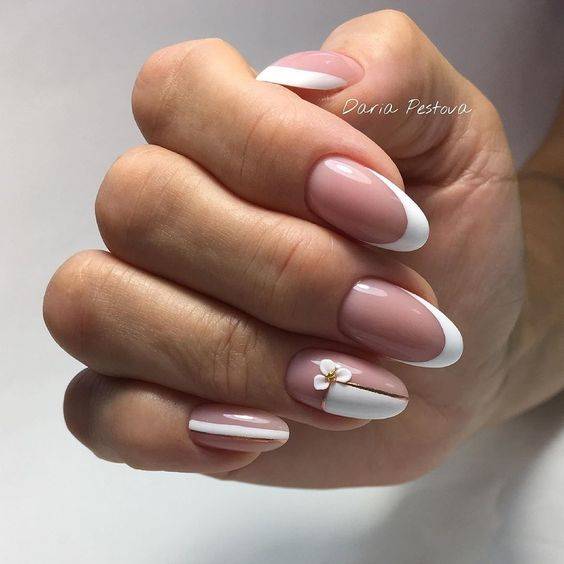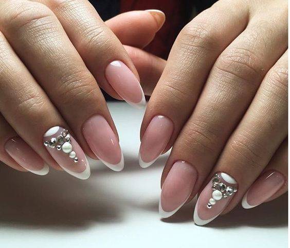 При этом можно дать волю фантазии и украсить его стразами, бусинками, перламутром, золотом, заменить классический белый лак на кончике ногтя на другой цвет или оттенок, который будет гармонично сочетаться с фасоном и цветом платья