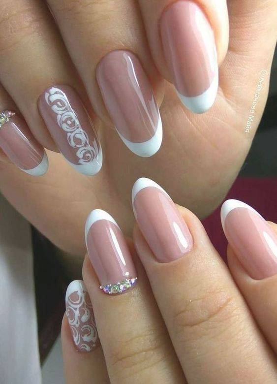 Всегда популярным и красивым является французский маникюр, выполненный в привычном белом цвете. Его можно украсить стразами, блестками, цветами, кружевом также белого или светлых цветов.