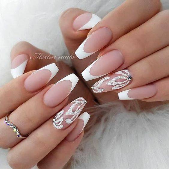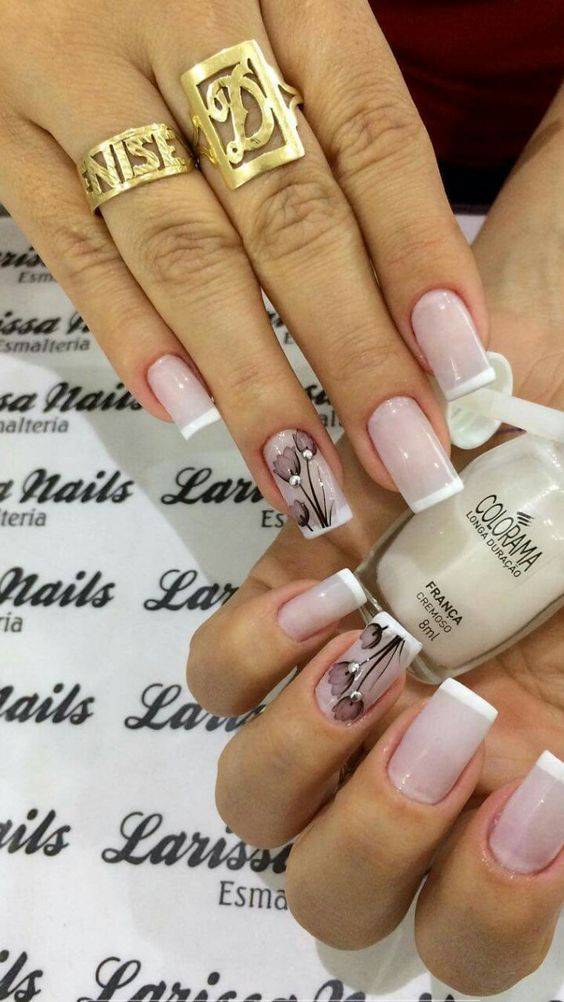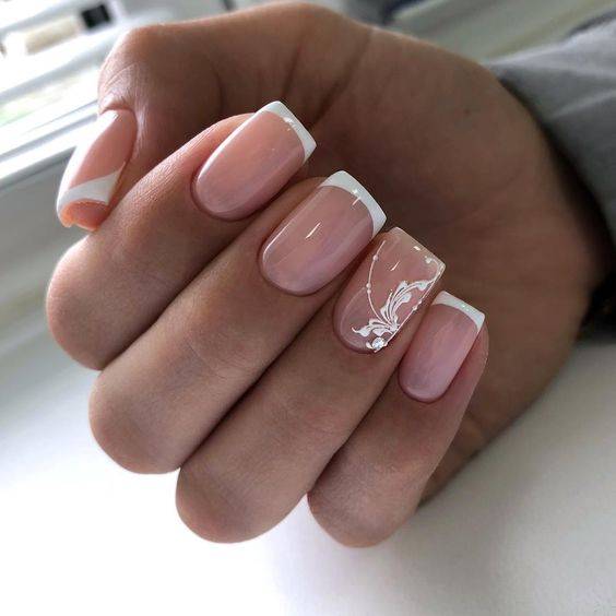 Многие совершают французский маникюр и украшают его красивыми узорами. Такими узорами могут быть абстрактные завитушки или красивые цветы. Чаще всего это розы, изображенные в белой или светлых цветовых гаммах.