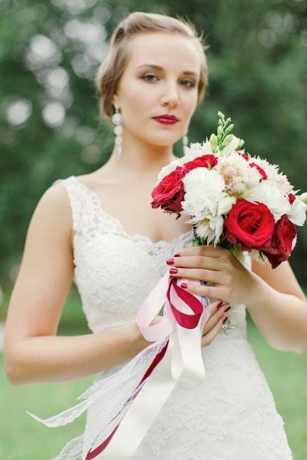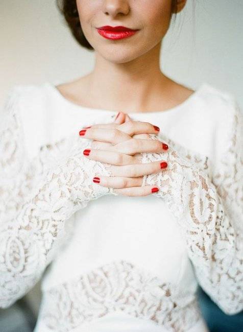 Маникюр в красных тонах олицетворяет страсть и смелость, а также желание невесты выделяться. Несмотря на предрассудки, что такому яркому цвету нет места в нежном и невинном образе, девушки продолжают выбирать именно красный маникюр, умело сочетая его с тематикой свадьбы или аксессуарами. Стильно и эффектно выглядят следующие: