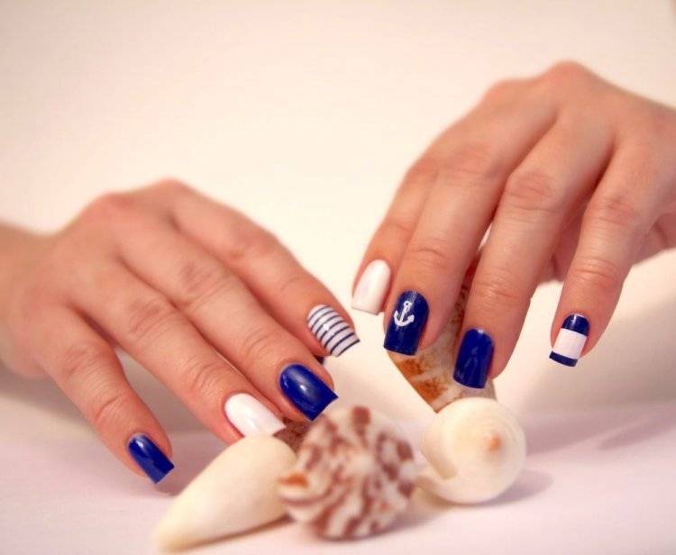 Синий цвет прекрасно сочетается с серебром, золотом, белым перламутром. К синему летнему платью или сарафану подойдут все оттенки синего лака, которые будут сочетаться с тоном наряда. Однако не стоит наносить на ногти лак, который будет точной копией цвета синего платья. Лак должен быть на два-три тона темнее.