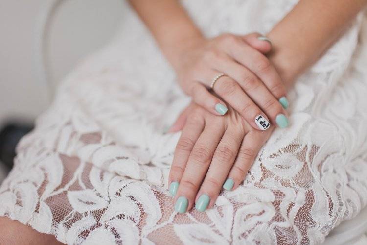 - Свадебный маникюр в бирюзовых тонах как альтернативный вариант голубому оттенку.