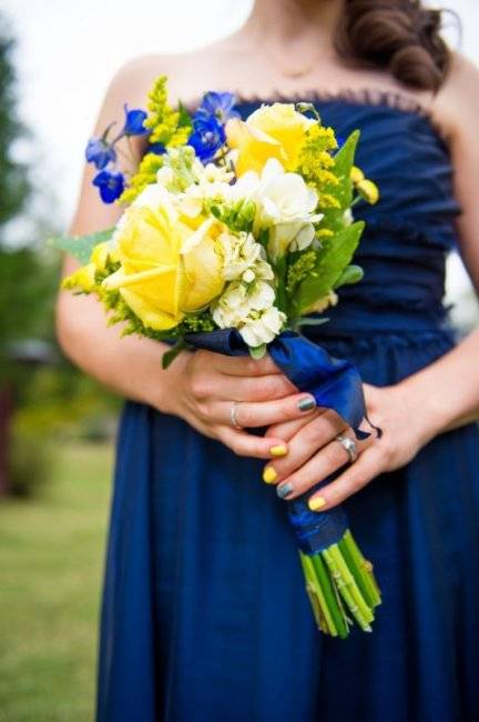 Холодные оттенки станут отличным решением для бледнокожих девушек, а загорелым невестам стоит обратить внимание на более теплые тона. Синий лучше всего сочетается с такими цветами, как:
