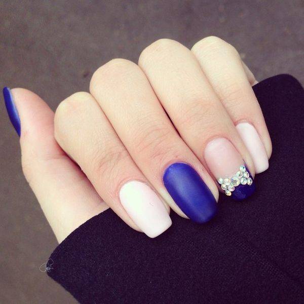 Очень красиво и оригинально смотрится маникюр, в котором соединены темно-синий матовый лак с глянцевыми вставками того же цвета. Если на вас надето синее платье классического фасона, предстоит деловой ужин или переговоры, предпочтительнее нанести на ногти лак перламутровых, спокойных и нейтральных оттенков.