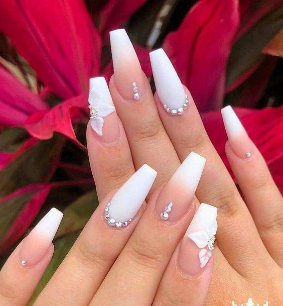 Всегда популярным и красивым является французский маникюр, выполненный в привычном белом цвете. Его можно украсить стразами, блестками, цветами, кружевом также белого или светлых цветов.