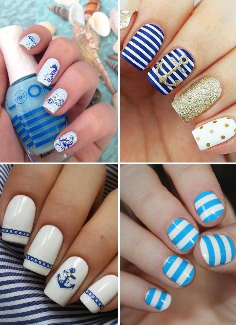 На фото вы можете увидеть свадебный маникюр, модный в 2023 году. Это морской стиль, подходящий для коротких и длинных ногтей, сочетающий в себе белые и синие оттенки лака, контрастные полоски.
