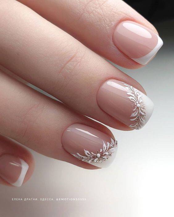 Многие совершают французский маникюр и украшают его красивыми узорами. Такими узорами могут быть абстрактные завитушки или красивые цветы. Чаще всего это розы, изображенные в белой или светлых цветовых гаммах.