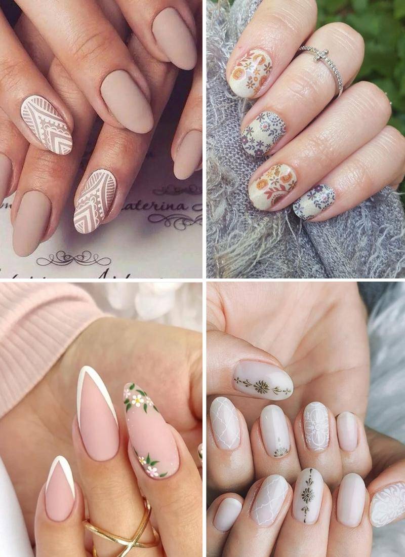 Модные тенденции свадебного маникюра включают в себя следование разным стилям. Один из таких – бохо, он может сочетать в себе разные этнические направления, например, винтаж, сафари, цыганский, милитари. На ногтях можно сделать природные орнаменты, интересные узоры, рисунки, положив их на нюдовую, однотонную основу.