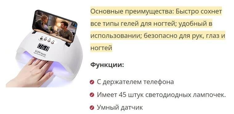 Основные преимущества: сушит практически все гелевые ногти; безопасна для глаз; быстрое отверждение. Эта светодиодная лампа для ногтей подойдет тем, у кого очень чувствительные ногти.